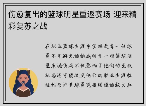 伤愈复出的篮球明星重返赛场 迎来精彩复苏之战